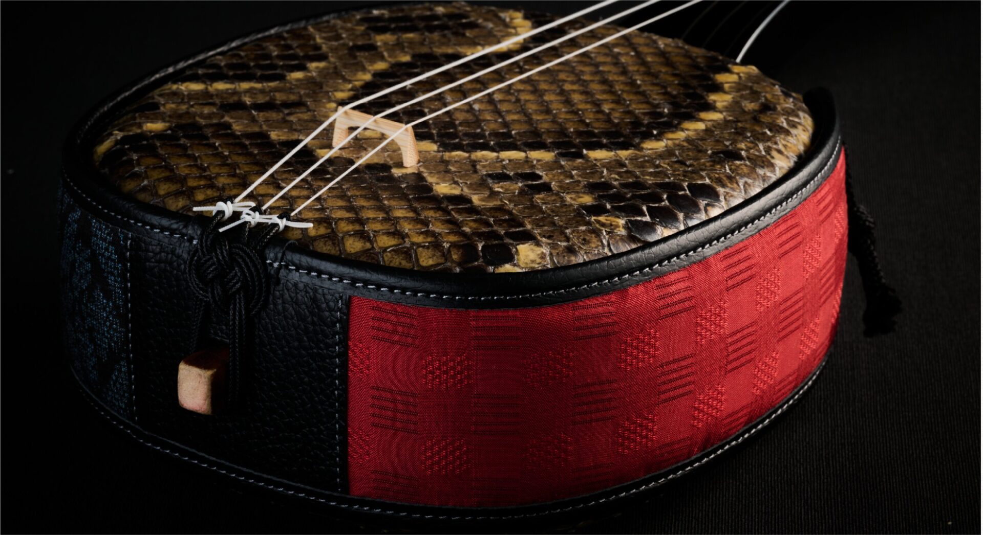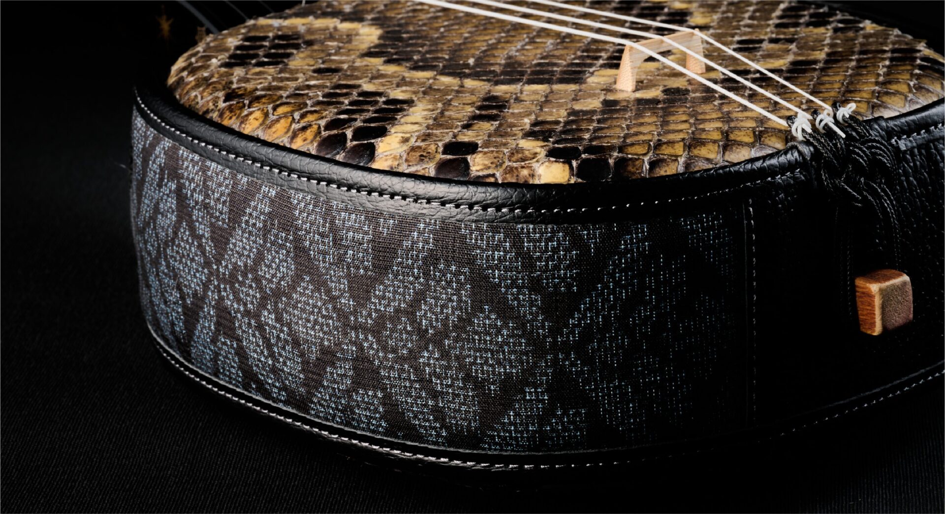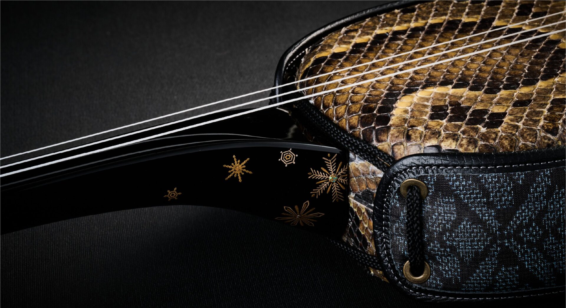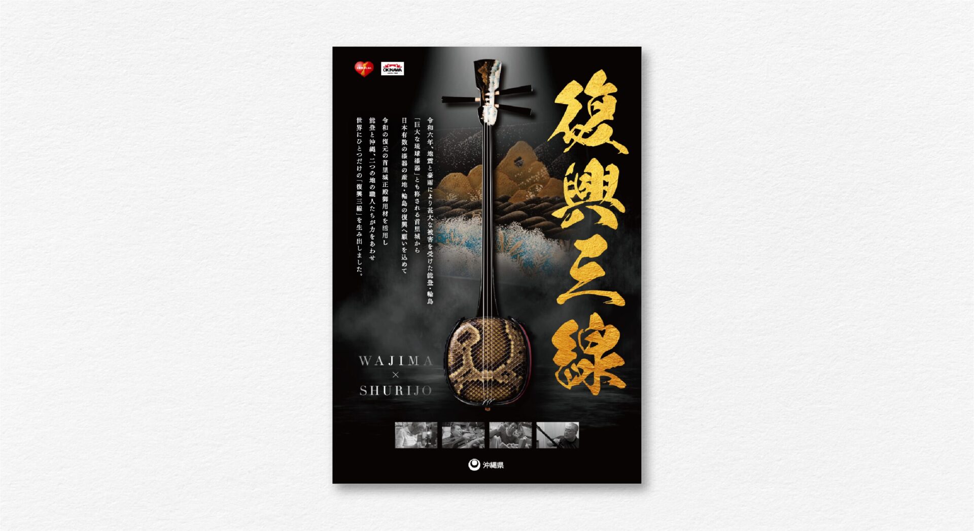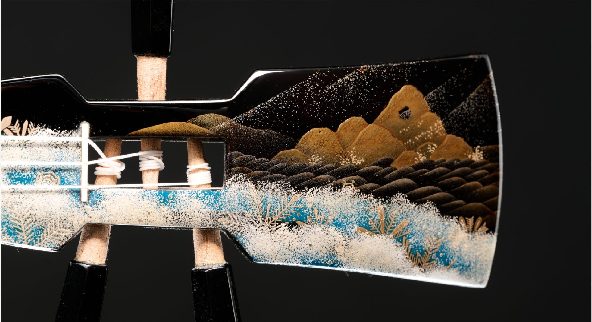 首里城と輪島の漆芸職人が双方の復興を願い、共同製作した復興三線。首里城正殿の御用材や輪島蒔絵、能登上布、首里織といった両地域の工芸の粋を集めた世界で一つだけの三線の魅力をビジュアルでも表現した。